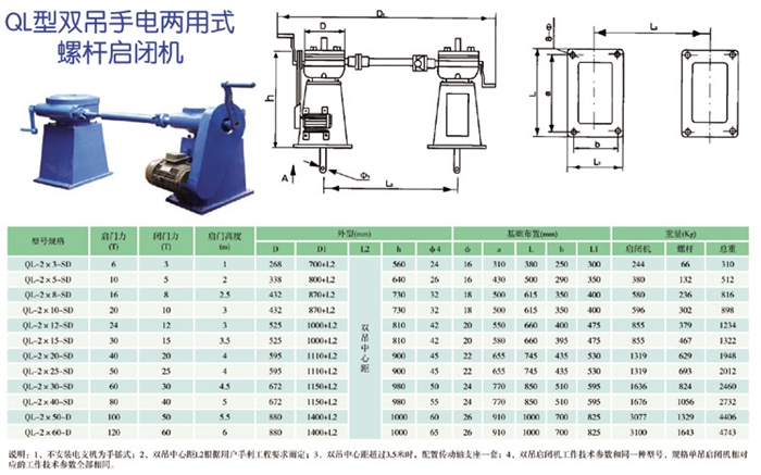 1.雙吊點(diǎn)螺桿式啟閉機(jī)廣泛用于:水利水電、水庫(kù)、河道、養(yǎng)殖排灌等各種水利工程。本系列啟閉機(jī)按吊點(diǎn)數(shù)分為單吊點(diǎn)和雙吊點(diǎn)兩種型號(hào),按驅(qū)動(dòng)方式分為手動(dòng)、電動(dòng)和手電兩用三種形式,一般啟閉容量超過(guò)600KN(單機(jī))時(shí)不再配置手動(dòng)機(jī)構(gòu)。我公司生產(chǎn)的QL型系列雙吊點(diǎn)螺桿啟閉機(jī)啟門(mén)力為3KN-650KN,超過(guò)650KN(單機(jī))時(shí)可特殊設(shè)計(jì)。
